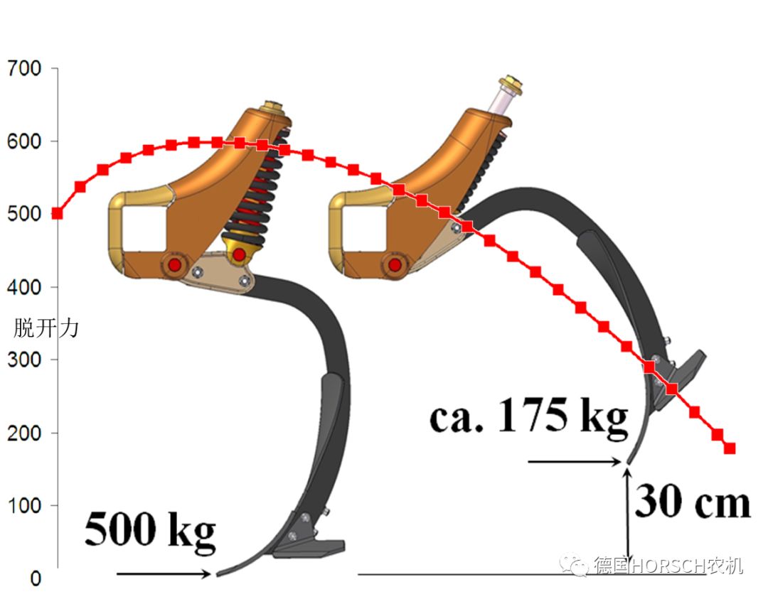 3.防过载保护设计,遇到坚硬石块时,弹簧弹起,能有效保护深松铲不受破坏变形。
