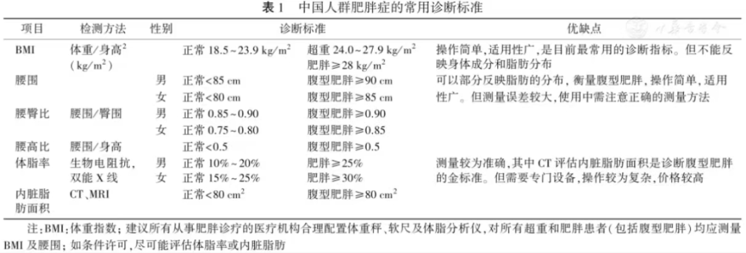 中国人群肥胖症的常用诊断标准