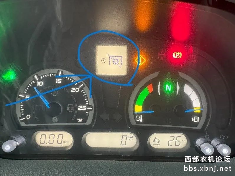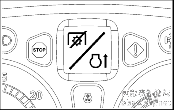 情况二:防失速功能启用 → 使用高惯性设备(如旋耕机、粉碎机、大方捆机)时,如低转速接合PTO,系统将禁止启动并显示符号。解决方法:关闭PTO开关后以较高转速重新接合。