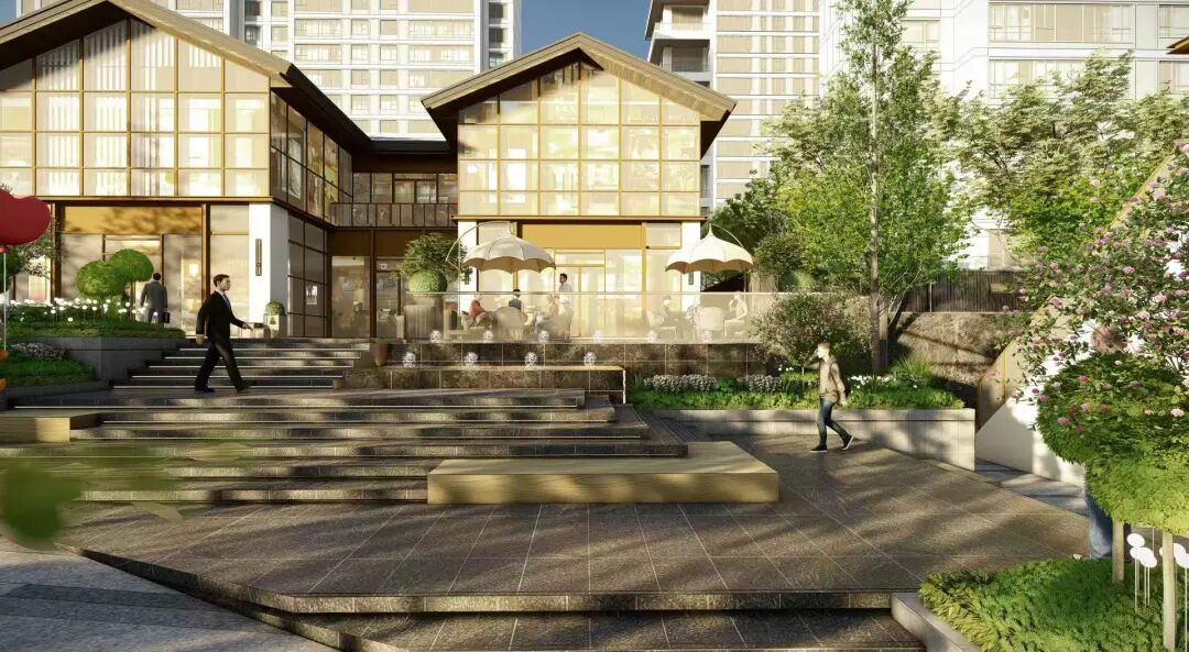 ④宋风商业街区。项目融合宋式美学,利用场地高差,打造融合传统意境的现代商业街区。建筑外立面采用铝板、大理石与玻璃幕墙的复合材质,风格类似成都太古里的新中式风格。