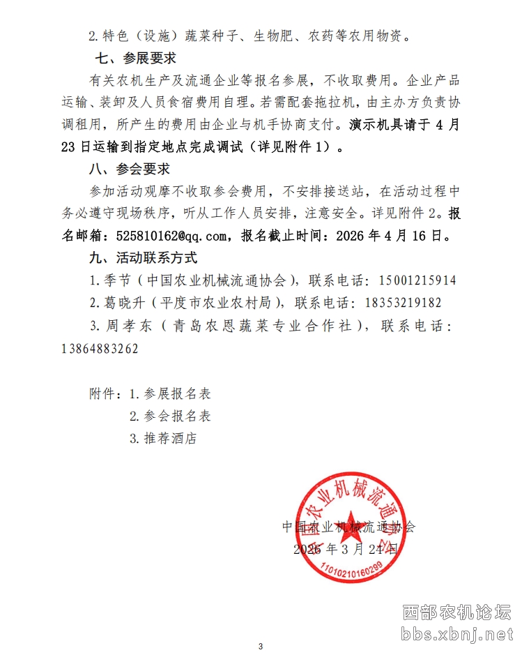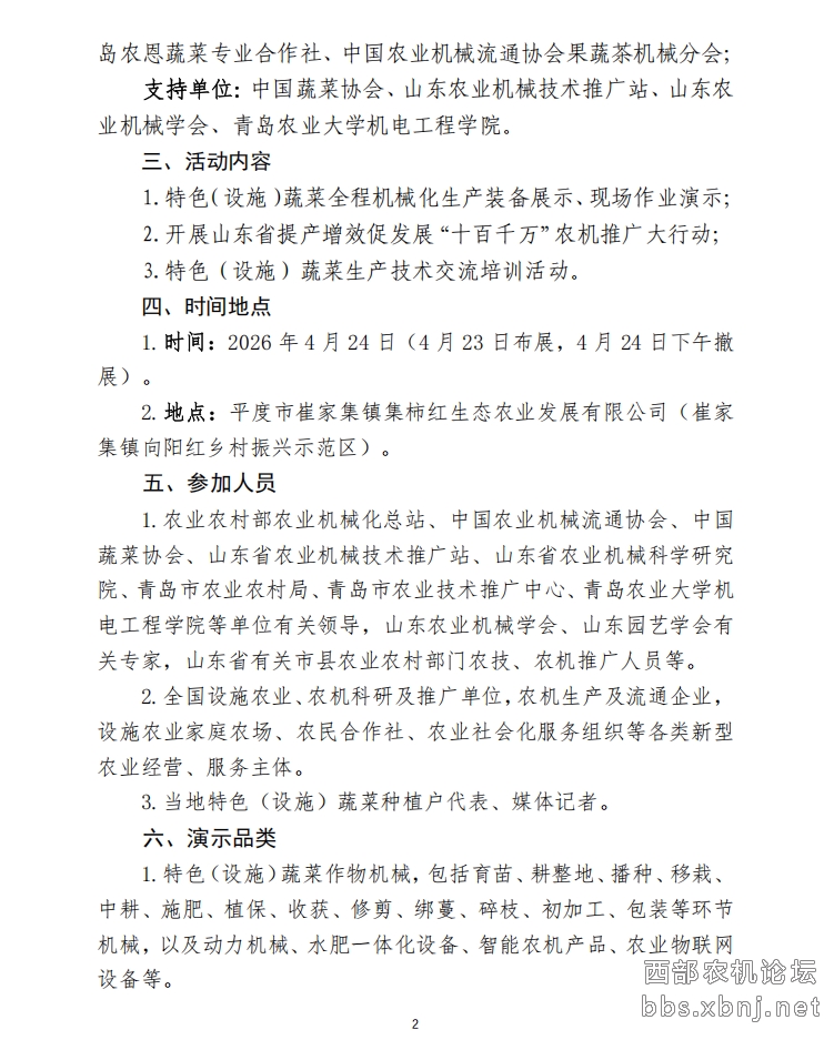 2026年是“十五五”开局之年,为认真贯彻落实《中共中央国务院关于锚定农业农村现代化 扎实推进乡村全面振兴的意见》要求,深入推进山东省提产增效促发展“十百千万”农机推广大行动,全面提高设施蔬菜农业全程机械化发展和产业发展水平,大力推进机器换人,有效促进设施农业提质增效、提档升级,中国农业机械流通协会、青岛市农业技术推广中心等单位计划于2026年4月下旬在青岛平度市联合举办农机地头展—全国特色(设施)蔬菜机械化生产推进活动暨山东省提产增效促发展“十百千万”农机推广大行动。现将有关事项通知如下。
