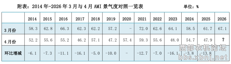 4月份市场内生动力呈现季节性转换特征:春耕核心需求逐步回落导致拖拉机等品类销售走弱,但田间管理与区域收获作业仍支撑相关机械需求;经理人信心指数保持高位,反映行业预期依然乐观;结合历史规律,4月景气通常低于3月,尤其在今年3月景气冲高至近年高点的背景下,环比回落压力较为明显。